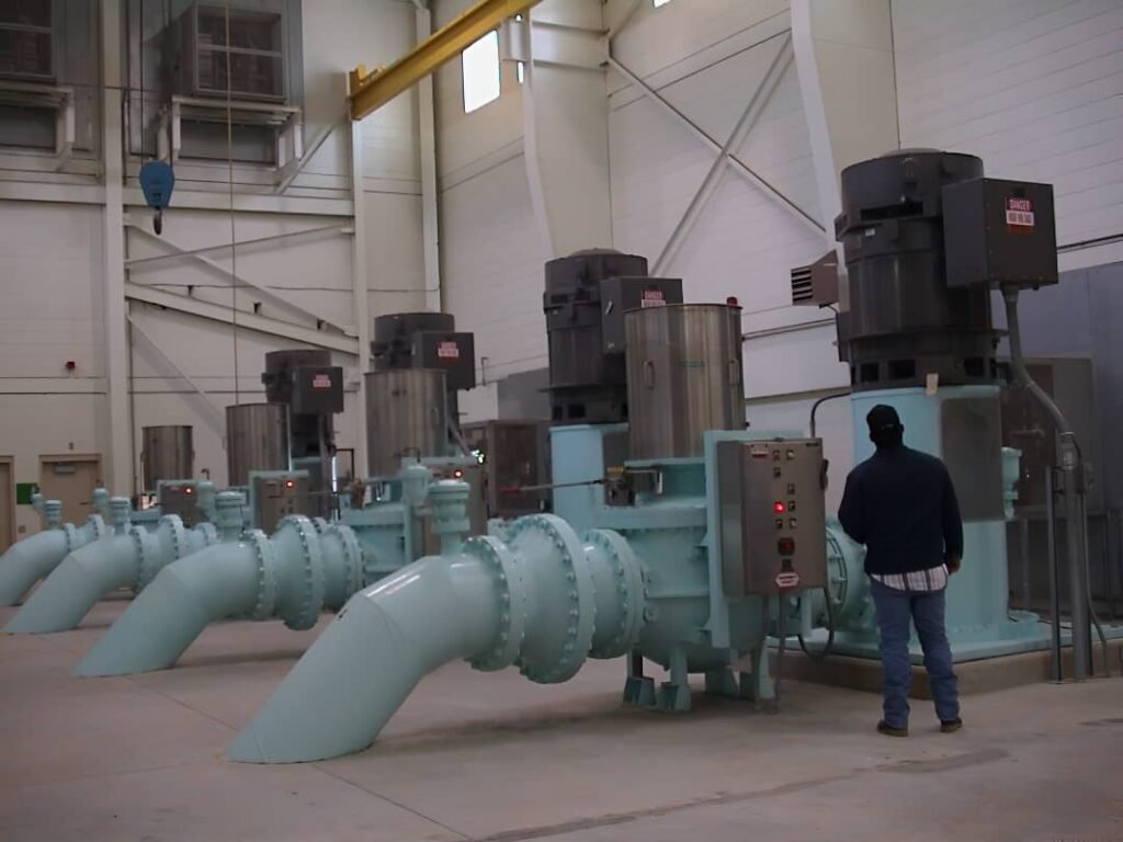 Expansion include demolishing and disposing of existing pump and control building, removal of existing (30” and 36”) Suction headers and underground water lines, well collection lines, pump discharge lines, relocate two (2) metal buildings, temporary relocation of 2500 KVA,12.47 KV/2.4 KV substation transformer equipment, and provide temporary power service. Installation of new underground and 60”Suction line and above ground headers and 48” underground discharge line and above ground headers. Construction of new Pump building including offices, break rooms, vertical turbine pumps, piping, valves, 1,000 HP, 2.4 KV variable frequency drives, emergency generators, all other associated equipment and appurtenances for a complete pump station. Construction of above ground diesel storage tanks and appurtenances.